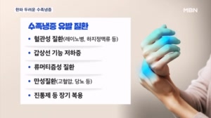 손발 얼음장에 저리기까지…수족냉증, 우리 몸이 알려주는 '이상 신호' ...해 말초혈관이 급격히 줄어드는 레이노증후군이나 말초동맥질환, 하지 정맥류 등 혈관성 질환이 원인이 될 수 있습니다. 또한, 갑상선 기능 저하증, 류머티즘성 질환 등 기저질환이나 고혈압이나 당뇨병 등 만성질환 또는 진통제 등 약물 장기복용도 수족냉증을 키울 수... 24.01.22 19:00