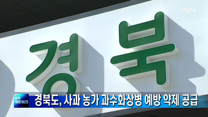 경북도, 사과 농가에 과수화상병 예방 약제 공급 경북도가 과수화상병 확산을 방지하기 위해 도내 사과 재배 농가에 긴급 예방 약제를 공급합니다. 도는 44억 원을 편성해 최근 과수화상병이 발생한 안동을 포함해 도내 모든 사과 농가 2만 8천여 곳에 약제를 공급할 방침입니다. 이철우 경북도지사는 "전... 21.06.23 09:20