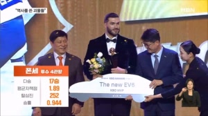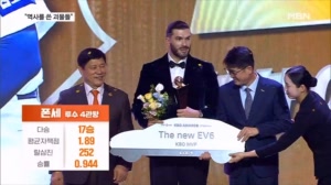 '최초 4관왕' 폰세, 압도적 MVP…신인상은 안현민 【 앵커멘트 】 외국인 투수 최초로 4관왕을 달성한 한화의 괴물 투수 폰세가 KBO리그 MVP를 거머쥐었습니다. 신인상은 육군 취사병 출신으로 괴력의 홈런포를 펑펑 터뜨린 KT 안현민이 차지했습니다. 황찬민 기자입니다. 【 기자 】... 2025.11.25