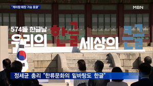전 세계 116명 '손에 손잡고' 열창…문 대통령 "가슴이 뭉클" ...니다. 최중락 기자가 보도합니다. 【 기자 】 '제 574돌 한글날' 기념식이 경복궁 수정전에서 열렸습니다. 세종대...점은 바로 한글의 세계화입니다. " 기념식에서는 특히, 국악신동 김태연 양과 전 세계 한글을 사랑하는 116명 가상... 2020.10.09