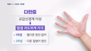 얼굴·손발에 땀 줄줄 '다한증'…"피부 아닌 신경이 원인" ...앵커멘트 】 얼굴과 손발, 겨드랑이 등에서 땀이 멈추지 않는 다한증은 특히 땀이 많이 나는 여름에 불편함이 더욱 커집니다. 그... 없이 얼굴과 머리에서 땀이 멈추지 않던 40대 환자는 결국 다한증 수술을 받기로 결정했습니다. ▶ 인터뷰 : 40대 다한증 ... 24.08.01 19:00