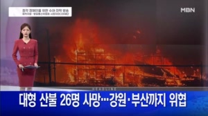 3월 27일 굿모닝MBN 주요뉴스 ... 숨지고 천년고찰이 소실되는 등 피해가 속출하는 가운데, 불길은 강원 동해안과 부산 기장까지 위협하고 있습니다. ▶ 오늘 '찔끔' 봄비…산불 진화에는 역부족 오늘(27일) 전국에 비가 예보됐지만, 경북 지역에 내리는 비는 5mm가 안 돼 산불 진화에는 큰 도... 25.03.27 07:00