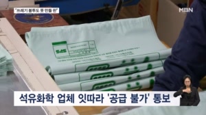 "쓰레기 봉투도 못 만들 판"…제조업 전반 위기 확산 .... 김종민 기자가 보도합니다. 【 기자 】 수도권에 있는 한 비닐봉투 제조 업체입니다. 쓰레기 종량제 봉투를 주로 생산하는데,...지를 잇따라 받았습니다. ▶ 스탠딩 : 김종민 / 기자 - "비닐봉투 제조의 핵심 원료인 폴리에틸렌입니다. 나프타로 만들어지는... 26.03.13 07:55