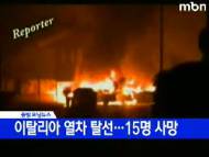 이탈리아 열차 탈선…15명 사망 ...가득 실은 화물열차가 탈선하면서 폭발해 최소 15명이 숨지고 50여 명이 부상했습니다. 이탈리아 언론들은 이탈리아 북부의 비아레지오 역으로 진입하던 열차의 맨 앞칸이 탈선하면서 뒤에 달린 4칸도 동시에 탈선해 열차에 들어 있던 LPG 가스가 폭발했다고... 09.07.01 01:00