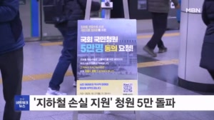 "지하철 무임손실 국비 지원해야" 국민 청원 5만 명 돌파 ...인 5만 명을 넘겼습니다. 서울교통공사 등 6개 도시철도 노사는 지난해 무임수송으로 7천억 원이 넘는 손실이 났다며 7년간 손실액의 80%인 1조 2천억 원이 보전된 코레일과 차별이 없어야 한다고 주장해 왔습니다. 이번 청원이 국민적 공감대를 얻는 데... 25.11.25 09:20