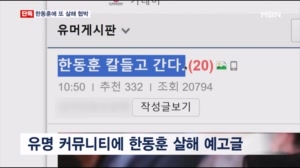 "흉기 들고 간다" 한동훈 살해 협박글…경찰, 작성자 추적 ...란하고 흉기 들고 복수하러 간다"는 내용이 담겼습니다. 신고를 접수한 충북경찰청은 한 후보 주소지 관할인 서울 수서경찰서로 이 내용을 통보하고 공조를 요청했습니다. 당시 한 후보는 오후에 충남 천안에서 4차 전당대회 합동연설회 일... 2024.07.16