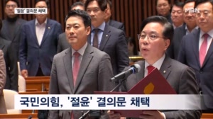 선거 D-86에야 '윤 절연' 나왔다…장동혁 침묵 속 민주 "쇼" ...고도 끝내 직접적인 입장을 밝히지 않은 채 침묵을 지키고 있습니다. 국민의힘은 어제(9일) 긴급 의원총회를 열고 소속 의원 전원 명의로 12·3 비상계엄에 대한 사과와 윤 전 대통령의 정치 복귀에 반대한다는 내용을 담은 결의문을 발표했습니다. 국민의힘은 결의문을 통해 "잘못된 12·3 비상계엄 선포로 인해 큰 혼란과... 26.03.10 09:58