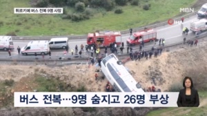 튀르키예 버스 전복 사고…최소 9명 사망 ...서 인명 피해가 생기는 교통사고도 자주 발생하고 있습니다. 지난달 30일에는 튀르키예 가지안테프의 고속도로에서 안개로 인해 차량 10대가 연쇄 추돌하면서 2명이 숨지고 11명이 다쳤습니다. MBN뉴스 정태웅입니다. 영상편집 : 최형찬 그래픽 : 권예지 26.02.02 07:00