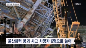 울산화력발전소 매몰자 시신 1구 추가 수습…사망자 6명으로 늘어 ...습됐습니다. 소방당국은 오늘 새벽 1시 18분 무너진 보일러 타워 5호기 잔해 속에서 30대 김 모 씨의 시신을 수습했다고 밝...물이 추가로 붕괴할 위험성이 컸습니다. 소방당국은 400t급 크레인으로 무너진 5호기의 상부 구조물을 먼저 고정한 채, 하부에... 25.11.13 02:21