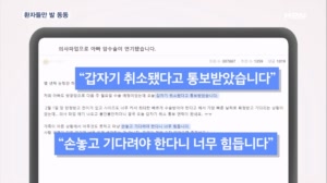 "애꿎은 환자들 피해"...의료 공백에 환자들 발만 동동 ...습니다. 암환자도 보호자도 불안감에 발만 동동 구르고 있습니다. 한여혜 기자가 보도합니다. 【 기자 】 어머니가 편도암 3기로 병원에 입원한 김미경 씨는 불안한 하루하루를 보내고 있습니다. 운 좋게 지난 목요일에 수술은 했지만 조기 퇴원을 시키지는 않을까 하는 걱정 때문입니다. ▶ 인터뷰 : 김미경 / 입원 환자 보호자 - "손... 2024.02.19