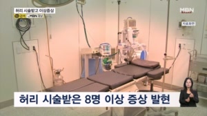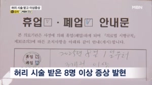 강릉서 허리 시술 받고 8명 이상증상…1명은 숨져 ...는 얘기는 들었는데." ▶ 스탠딩 : 전민석 / 기자 - "이 정형외과는 보건 당국의 시술 중단 권고를 받고 지난 1일부터 휴진하고 있습니다." 지난 6월부터 7월 사이 이 의원에서 허리 통증을 줄이는 신경 차단 시술을 받은 환자 8명이 한꺼번에 이상... 25.08.05 19:00